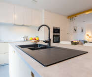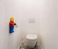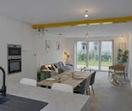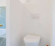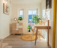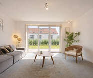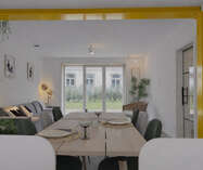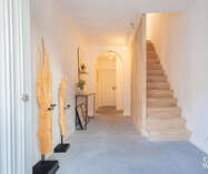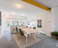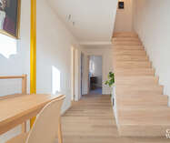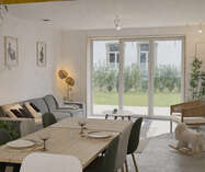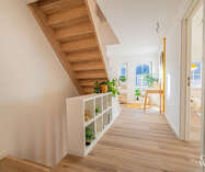 Upon entering, you step into a spacious entrance hall with a guest toilet and a storage/laundry room with connections for a washing machine and tumble dryer. The open-plan kitchen and living room overlook the terrace and garden.