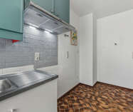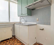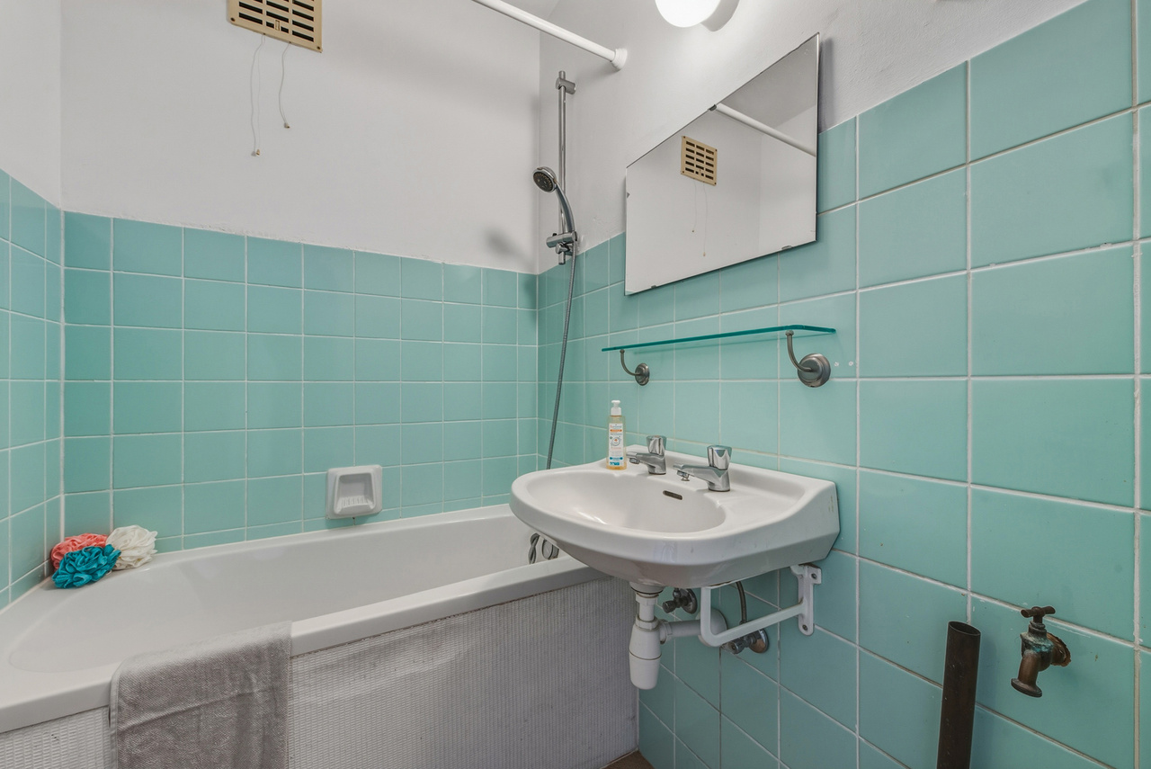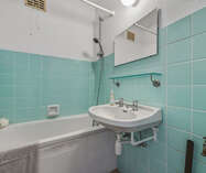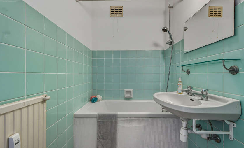 La distribution comprend un hall d’entrée spacieux avec placard intégré, une salle de bains avec baignoire et raccordements pour machine à laver et sèche-linge, un séjour lumineux avec accès à la terrasse, ainsi qu’une cuisine semi-équipée.