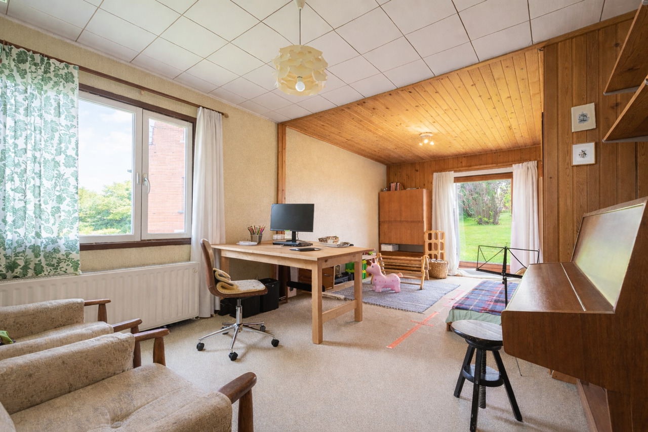 La maison dispose d’un vide sanitaire sous toute la surface, ainsi que d’une cave et d’un garage. PEB F – obligation de rénovation : à rénover vers un label D dans un délai de 6 ans. Disponible juin 2027.