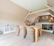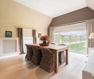 La salle à manger dispose d’une grande fenêtre offrant une vue sur le jardin et les champs, apportant une belle luminosité naturelle et renforçant le caractère rural du bien.