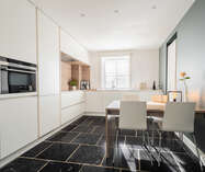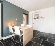Au rez-de-chaussée se trouvent une cuisine lumineuse avec coin repas et un salon chaleureux avec feu ouvert. Une porte coulissante mène vers une seconde pièce de vie comprenant salle à manger et espace polyvalent. Ce niveau dispose également d’une toilette séparée, d’une buanderie et d’un garage.