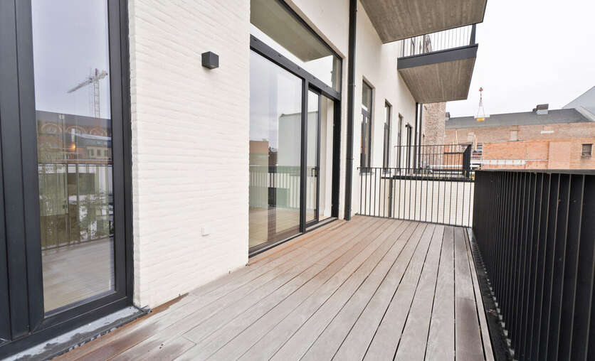 Aan de andere kant van de inkomhal liggen de twee slaapkamers, elk met een eigen badkamer – ideaal voor wie privacy belangrijk vindt. Daarnaast is er een multifunctionele ruimte die toegang geeft tot het achterste terras, met zicht op de rustige privé binnenkoer van het project. Aan de voorzijde van het appartement bevindt zich nog een tweede terras, afgewerkt met klassieke zuilen.