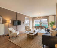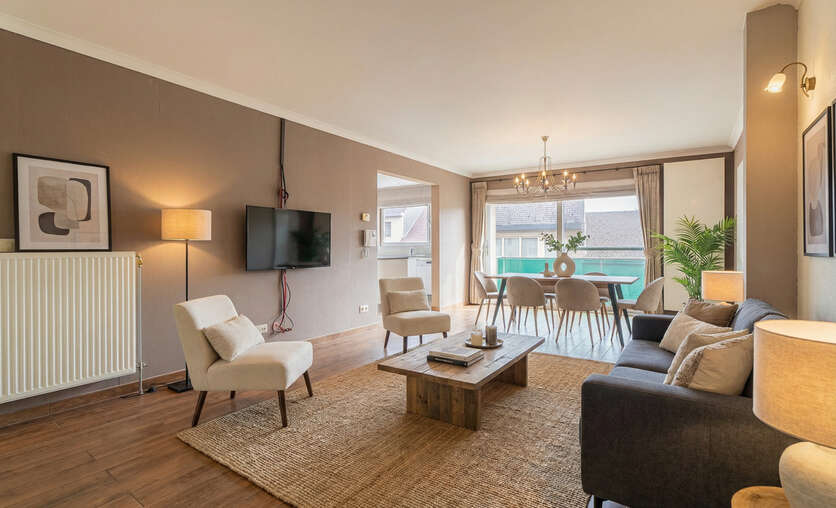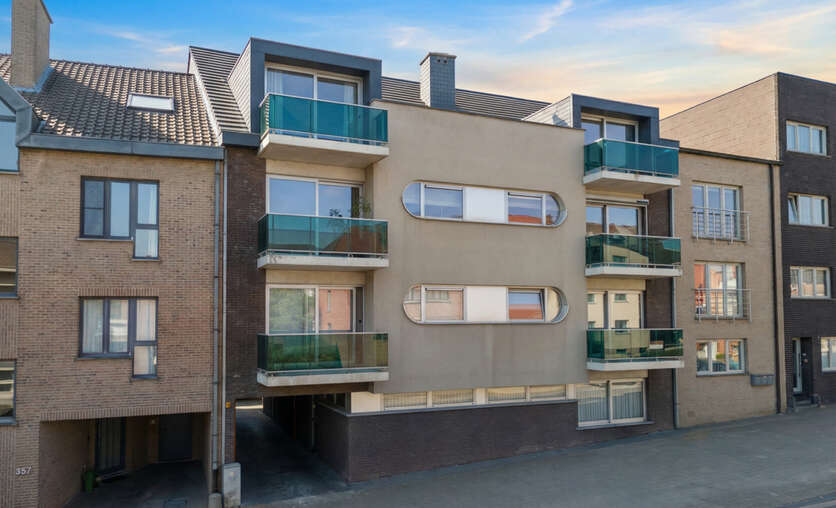 Het appartement beschikt over een inkomhal met apart toilet, een lichtrijke woonkamer met eetplaats en een moderne open keuken uitgerust met kwalitatieve Miele-toestellen. Verder zijn er twee slaapkamers, een stijlvolle badkamer met inloopdouche, een praktische berging in het appartement en een extra kelderberging.
