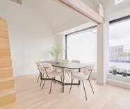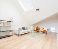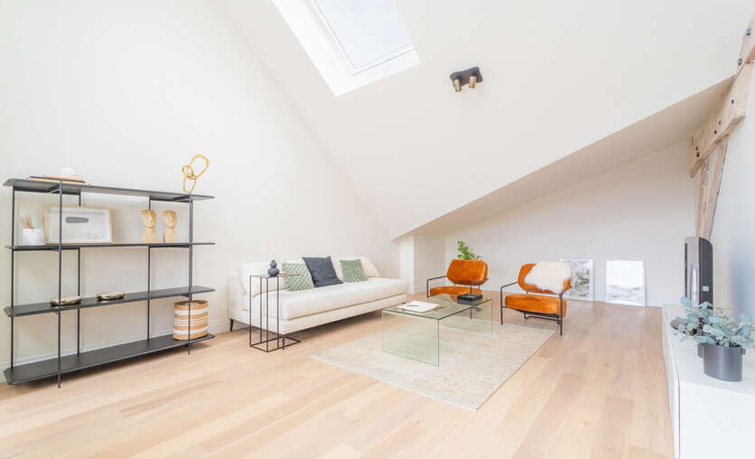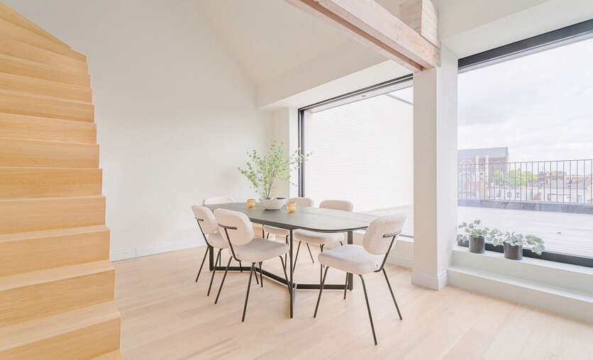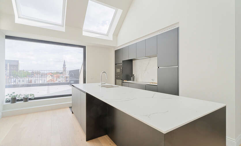 De lichtrijke leefruimte straalt klasse uit en sluit naadloos aan op de open, volledig geïnstalleerde keuken. Grote raampartijen brengen overvloedig daglicht naar binnen en geven toegang tot een groot terras, waar u geniet van een prachtig uitzicht.