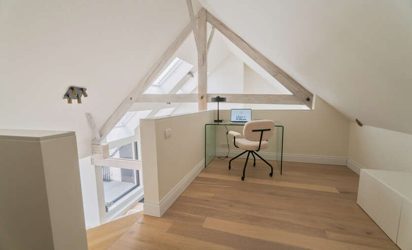 Op de bovenste verdieping bevindt zich een multifunctionele ruimte die perfect dienst kan doen als bureau, hobbyruimte of extra zitruimte.