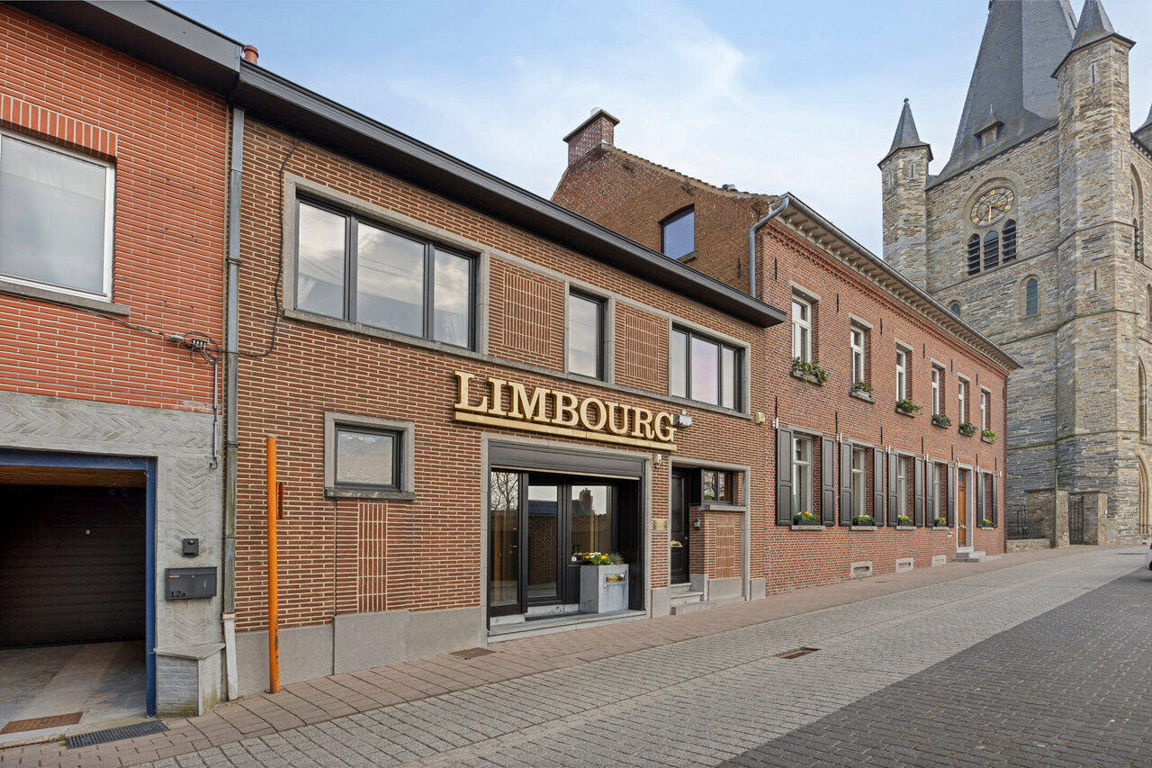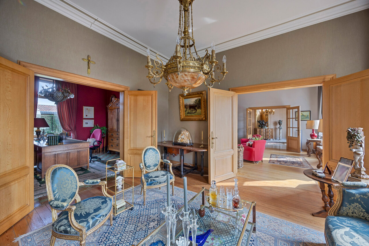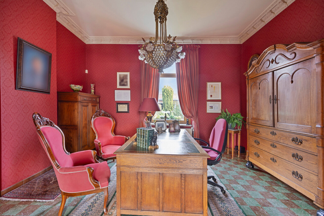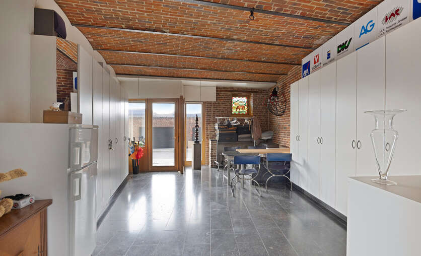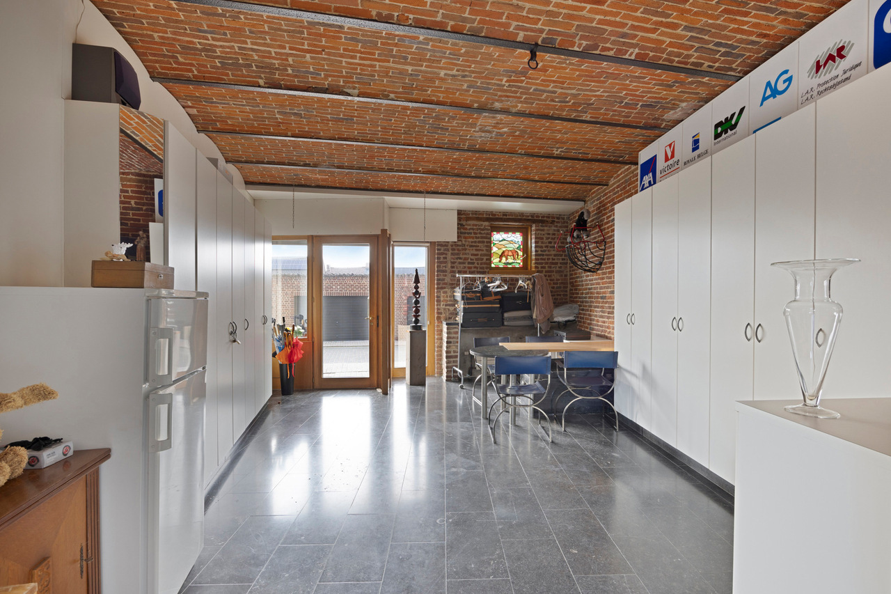 Deze goed onderhouden woning heeft twee aparte ingangen, wat zorgt voor extra flexibiliteit. Het woongedeelte verwelkomt u met een ruime inkomhal met apart toilet, gevolgd door een lichtrijke woonkamer met eetplaats, een gezellig salon en een bureauruimte. Dankzij de hoge plafonds en grote ramen baadt de woning in natuurlijk licht. Via de gang bereikt u de keuken met eethoek, waar u geniet van een prachtig uitzicht op de tuin.