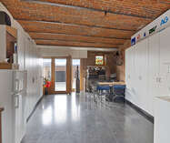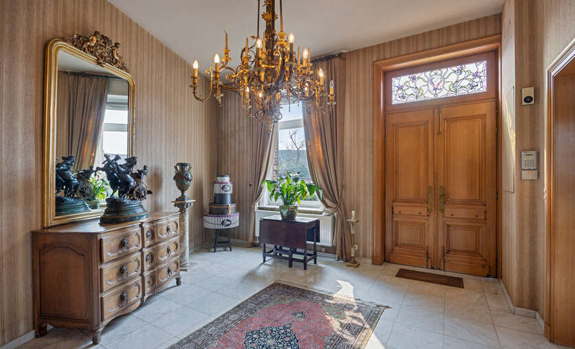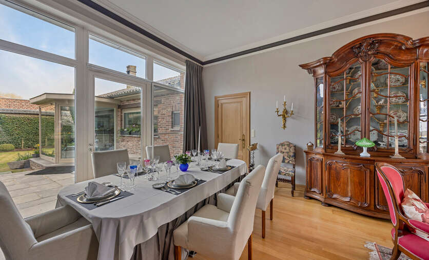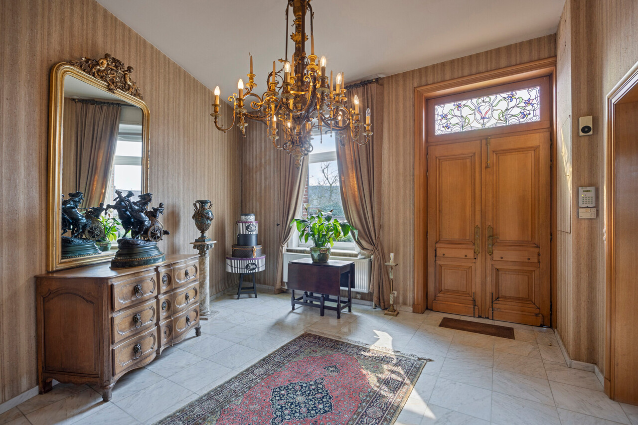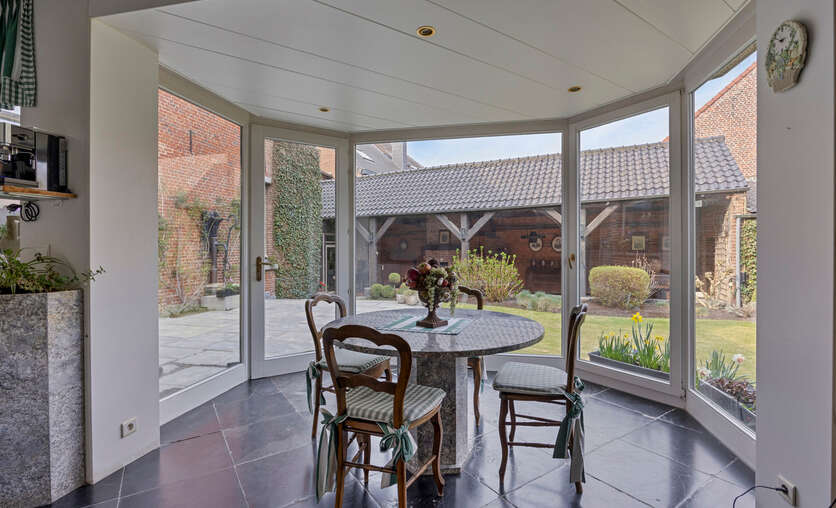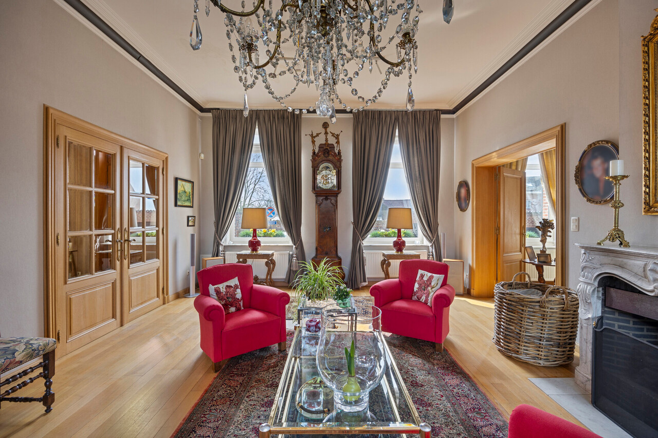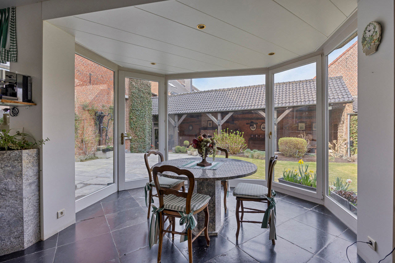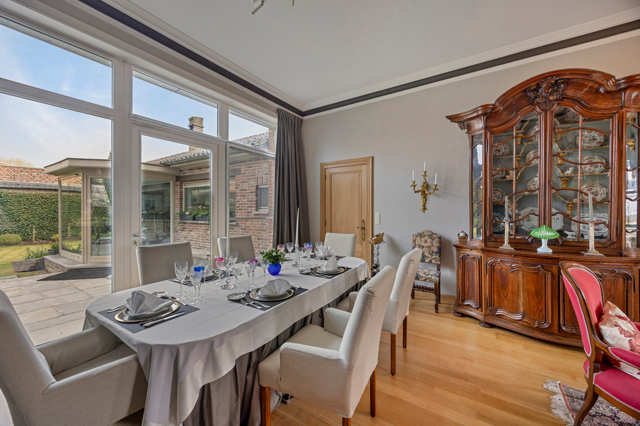 Deze goed onderhouden woning heeft twee aparte ingangen, wat zorgt voor extra flexibiliteit. Het woongedeelte verwelkomt u met een ruime inkomhal met apart toilet, gevolgd door een lichtrijke woonkamer met eetplaats, een gezellig salon en een bureauruimte. Dankzij de hoge plafonds en grote ramen baadt de woning in natuurlijk licht. Via de gang bereikt u de keuken met eethoek, waar u geniet van een prachtig uitzicht op de tuin.
