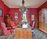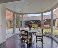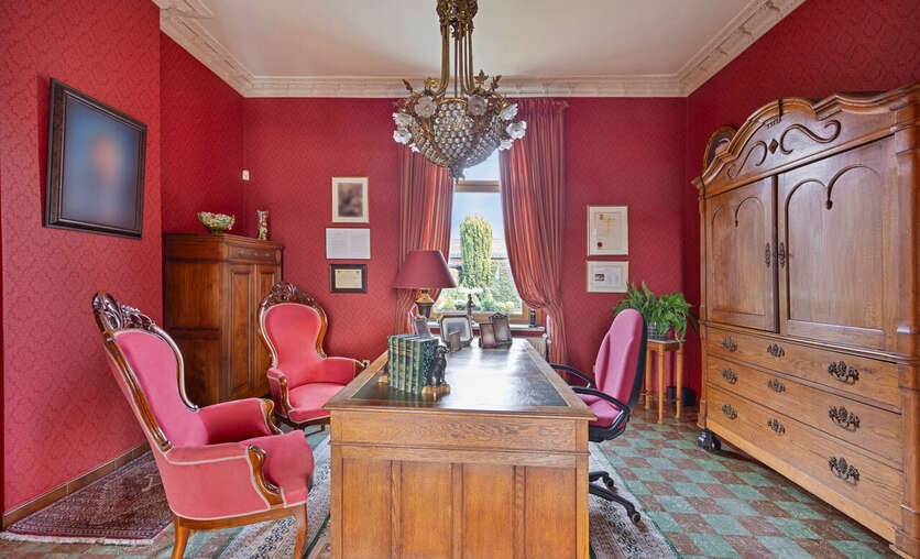 Het kantoorgedeelte beschikt over een aparte inkomhal met toilet, een bureauruimte met toegang tot de tuin en op de eerste verdieping een extra woonkamer met eetplaats, een keukentje, een badkamer en een slaapkamer. Beide units lopen door elkaar en zijn zowel boven als beneden met elkaar verbonden.