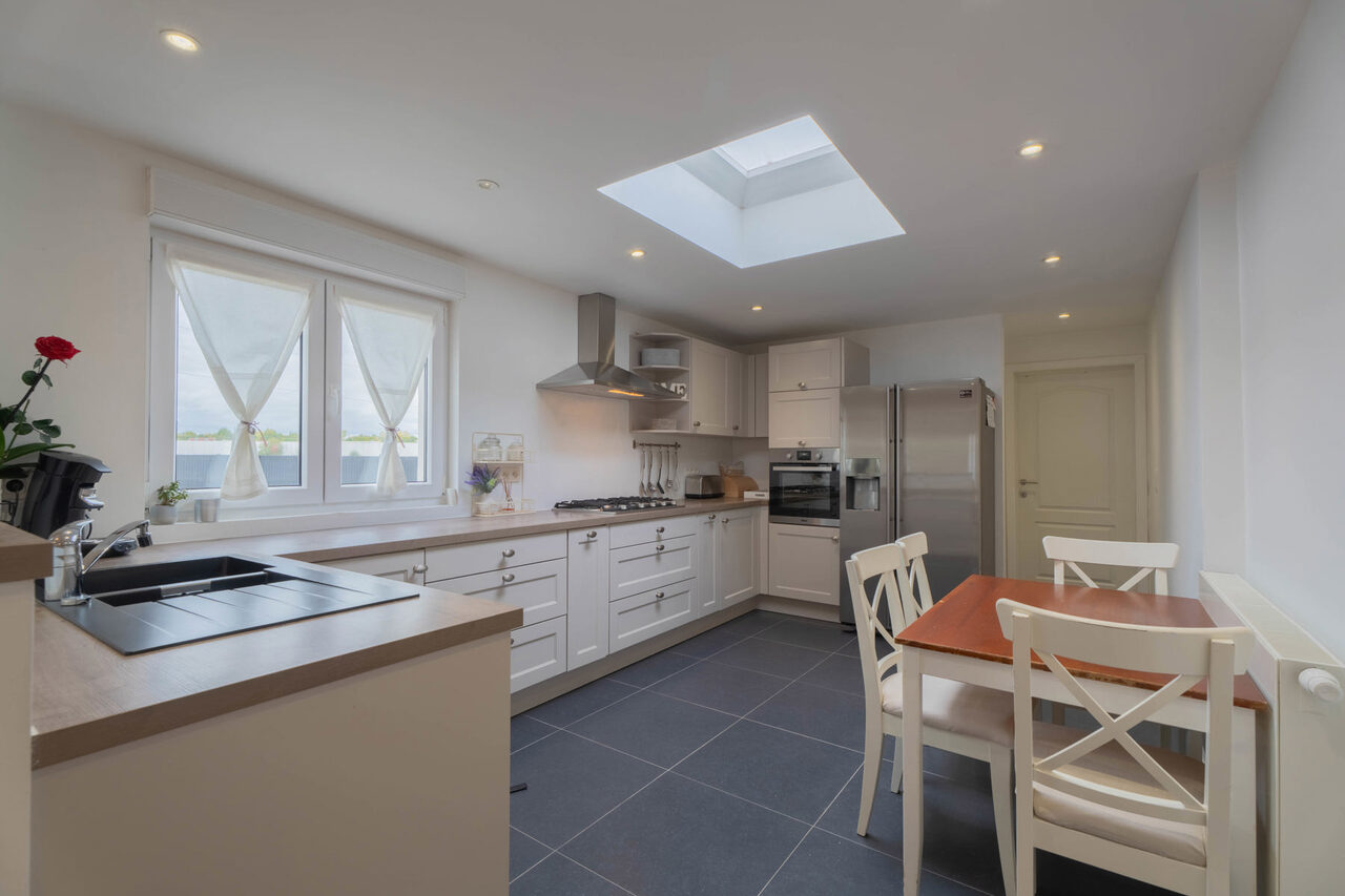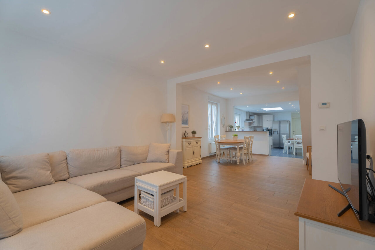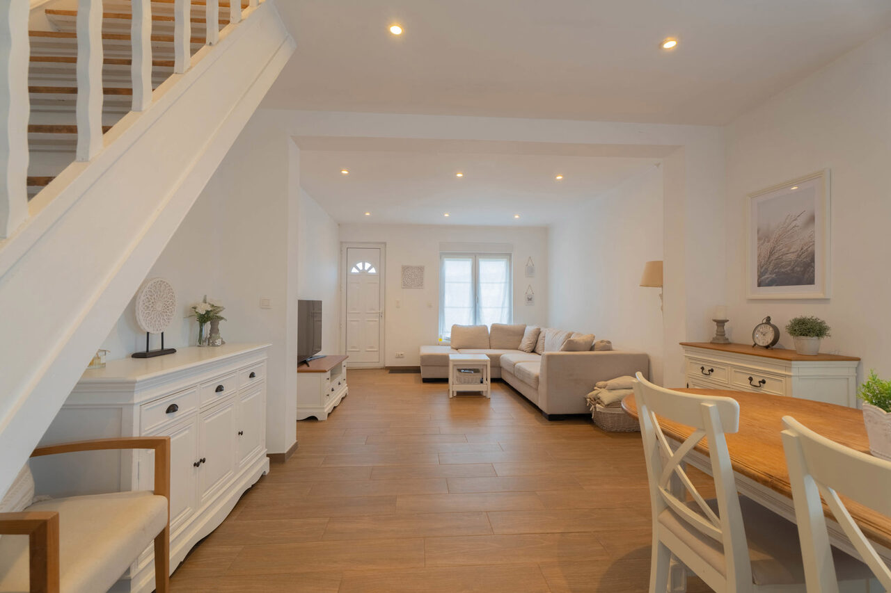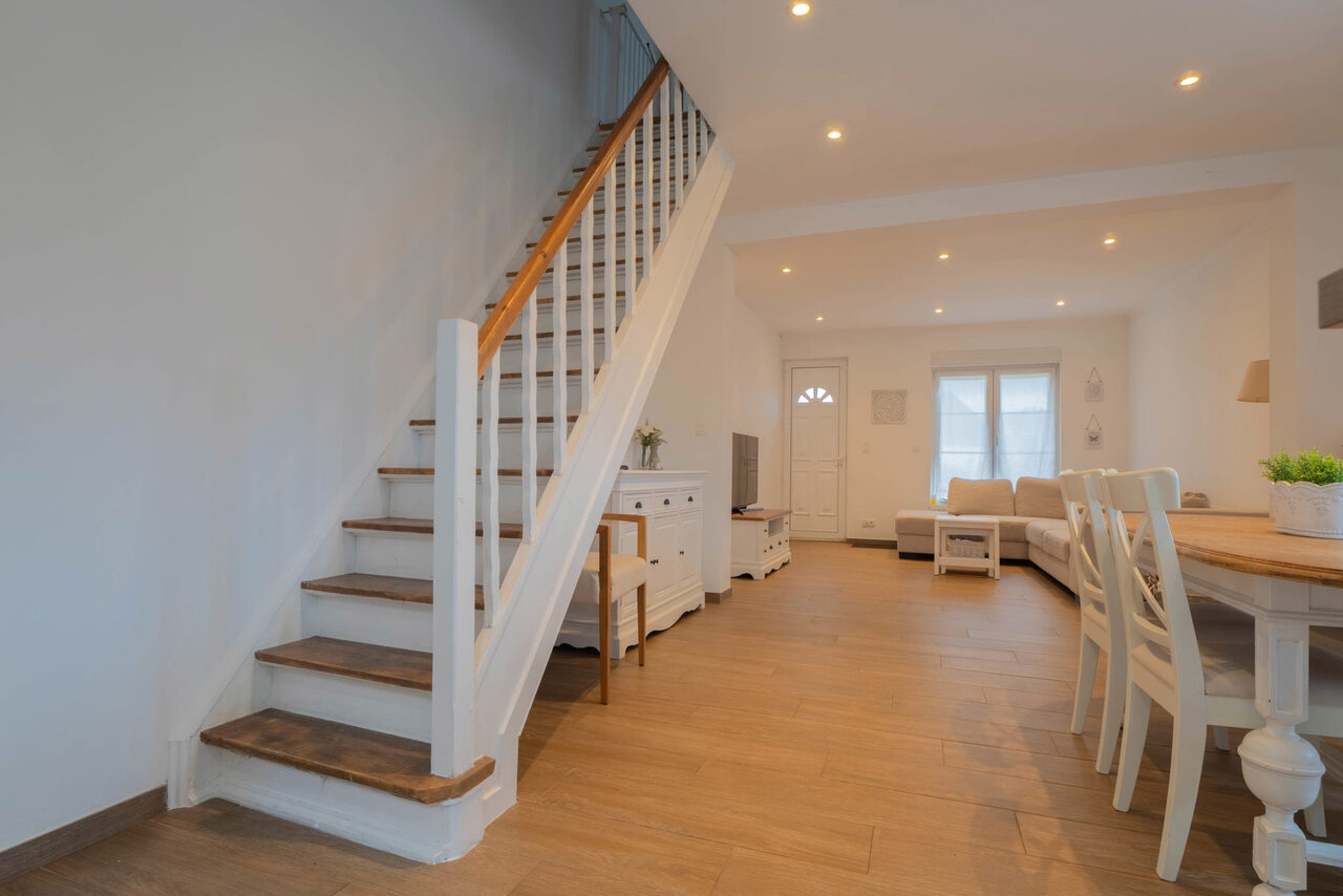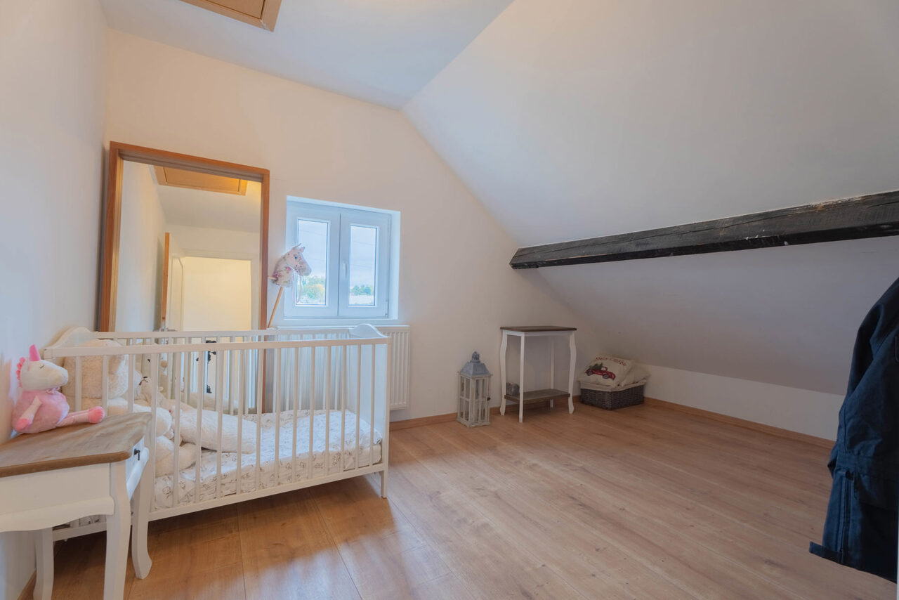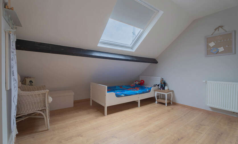 Ontdek deze rustig gelegen, toch dicht bij alle faciliteiten gezinswoning. De woning werd in 2017 gerenoveerd en bestaat uit een ruime woonkamer met eetplaats en open keuken, een ruime berging/wasplaats en apart toilet, op de eerste verdieping bevind zich een eerste slaapkamer en een badkamer met ligbad, inloopdouche, dubbele wastafel en wc, de zolderverdieping werd volledig ingericht tot 2 slaapkamers. Geniet van alle rust in de zuid georiënteerde tuin met zicht op de velden.
