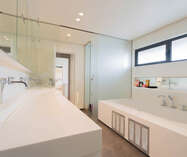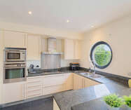 De eerste verdieping omvat een bureauruimte op de mezzanine, twee kinderslaapkamers en een royale master bedroom met dressing en suitebadkamer met dubbele douche, bubbelbad en dubbele lavabo.