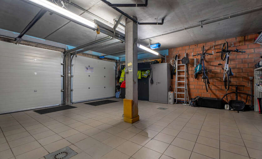 Op het gelijkvloers vind je een ruime inkomhal, een dubbel salon of salon–eetkamer met tweezijdige open haard en hoge glaspartijen tot in de nok, een open keuken, wasplaats en een garage van 50 m² met plaats voor twee wagens.