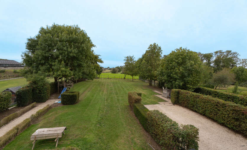 Buiten geniet je van een zuidgericht zonneterras, een grote tuin en een weide met fruitbomen met rechtstreekse straattoegang – perfect voor dierenliefhebbers of vrij beroep.