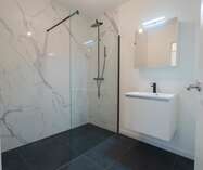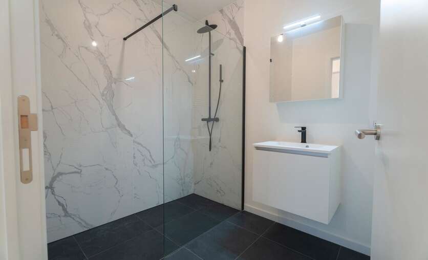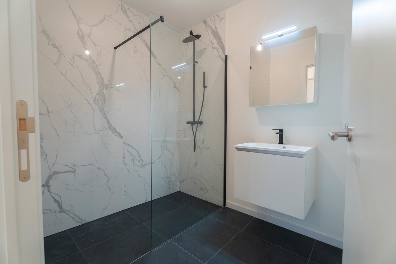 Op de bovenverdieping bevinden zich drie kamers, waaronder een ruime master bedroom met eigen dressing en ensuite badkamer. Daarnaast is er nog een tweede, aparte badkamer en een extra terras dat zorgt voor een aangenaam buitengevoel.