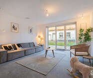 Bij het binnenkomen kom je in een ruime inkomhal met gastentoilet en een berging met aansluitingen voor wasmachine en droogkast. De open keuken en woonkamer kijken uit op het terras en de tuin.