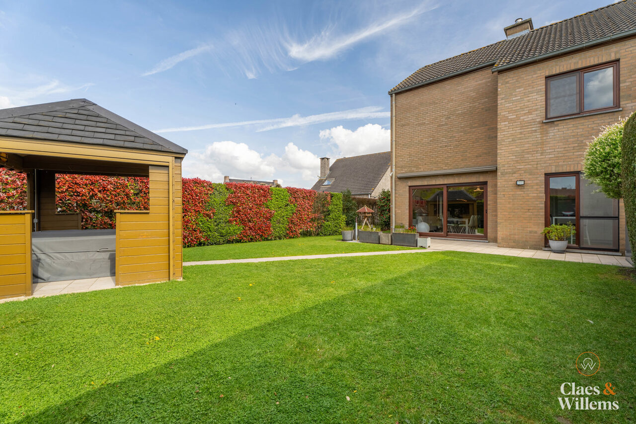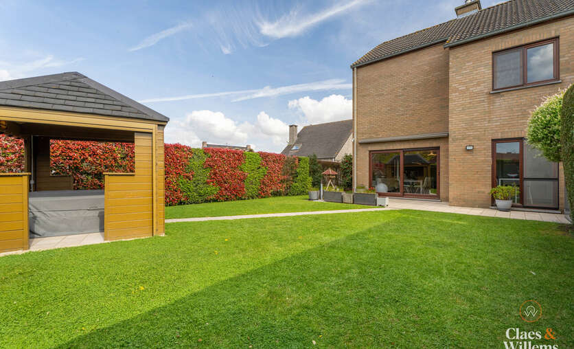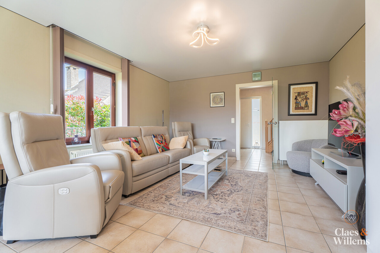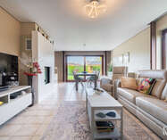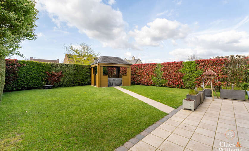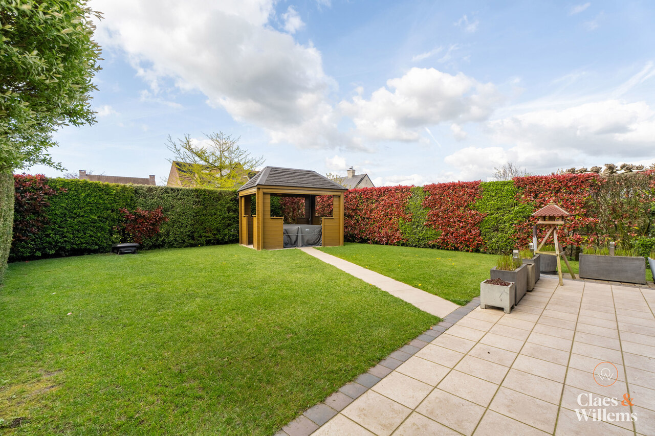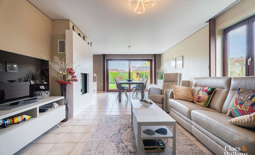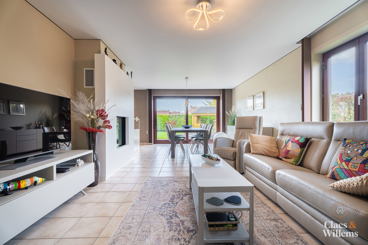 Het grote schuifraam in de leefruimte geeft uit op de verzorgde tuin met een overdekte loungehoek, een fijne plek om te ontspannen of gasten te ontvangen.