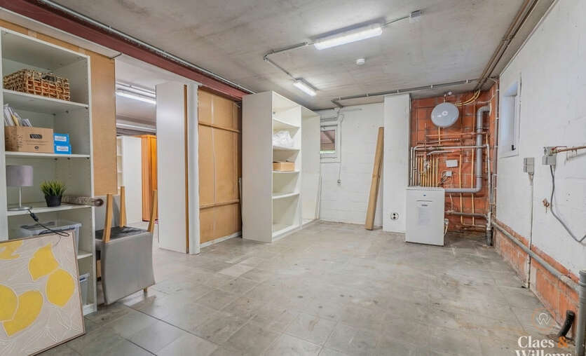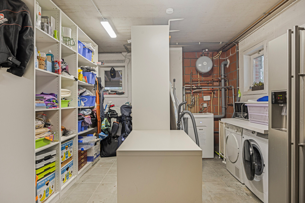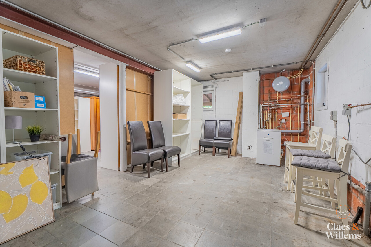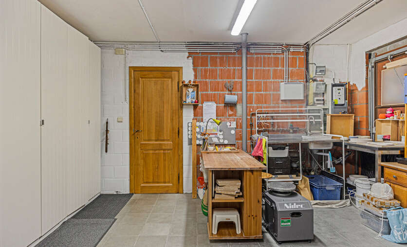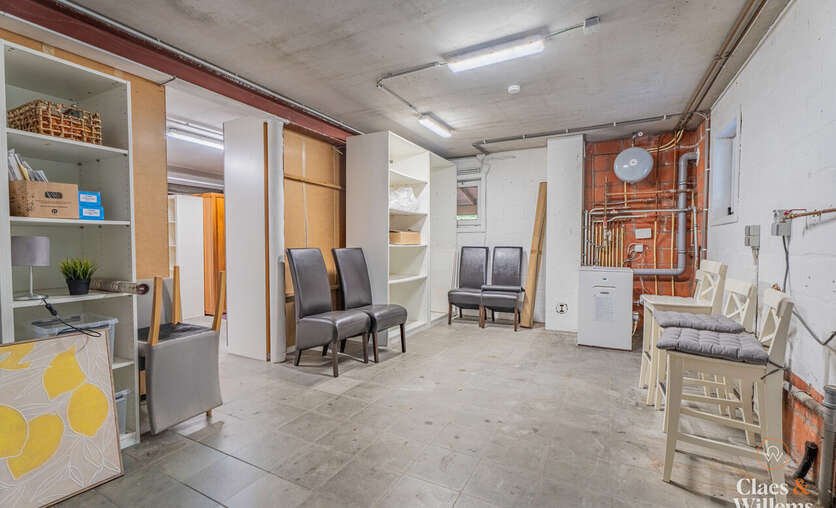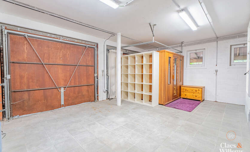 Het gelijkvloers omvat een dubbele garage (60 m²), een ruime inkomhal met gastentoilet, een leefruimte met open keuken en eetplaats, en een aanbouw van 82 m² met moderne open haard en zicht op de tuin via de grote ramen. Aan de oost- en zuidzijde ligt een gedeeltelijk overdekt terras met zicht op het zwembad* en de tuin. Daarnaast beschikt de woning over een health-made infraroodsauna voor zes personen.