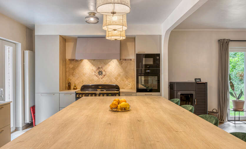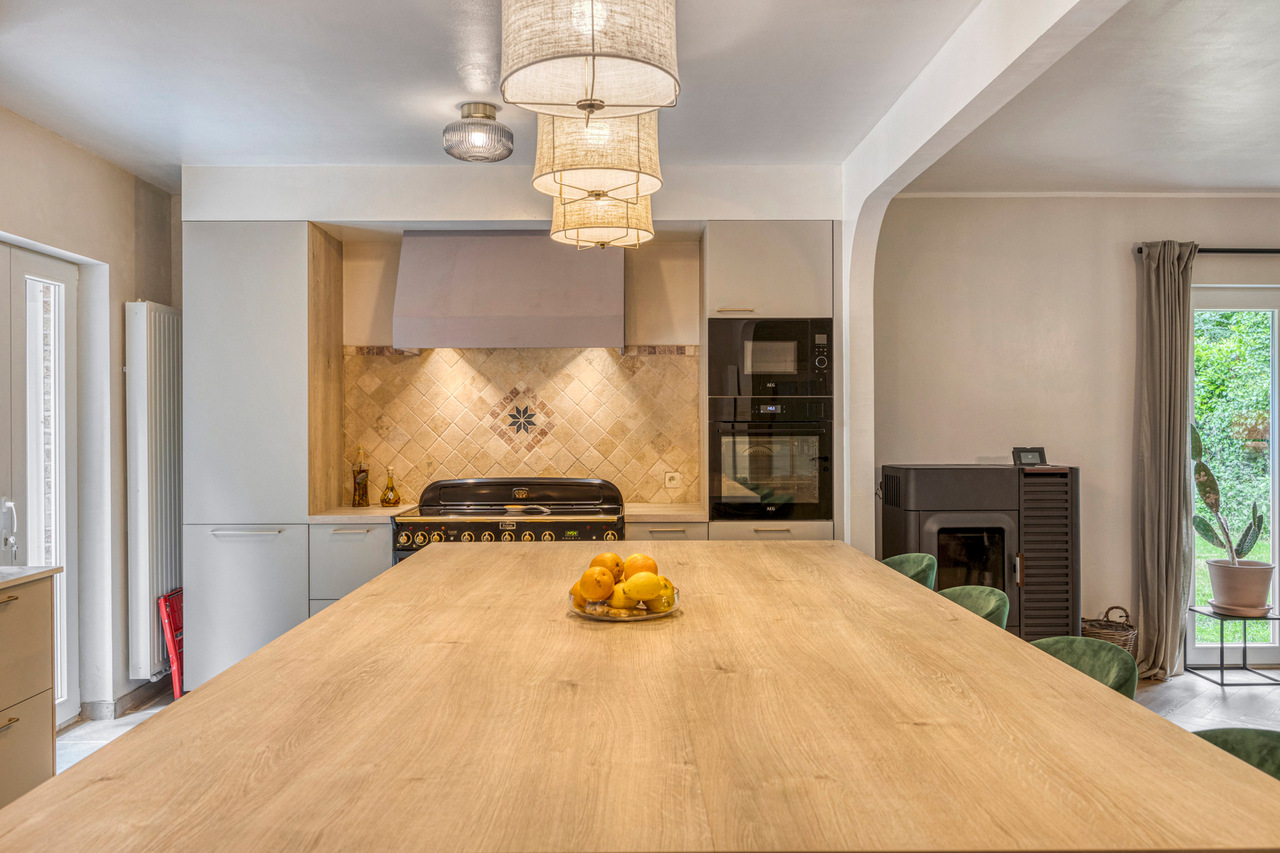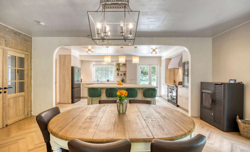 • Lichte woonkamer met houtkachel + pellet-/houtkachel (bedienbaar via app)